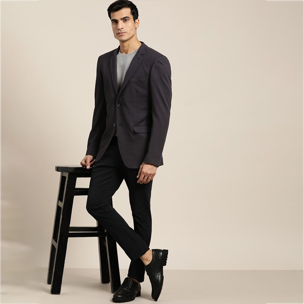 Black solid woven smart casual blazer, has a notched lapel collar, long sleeves, single-breasted with button closure, four pockets, an attached lining